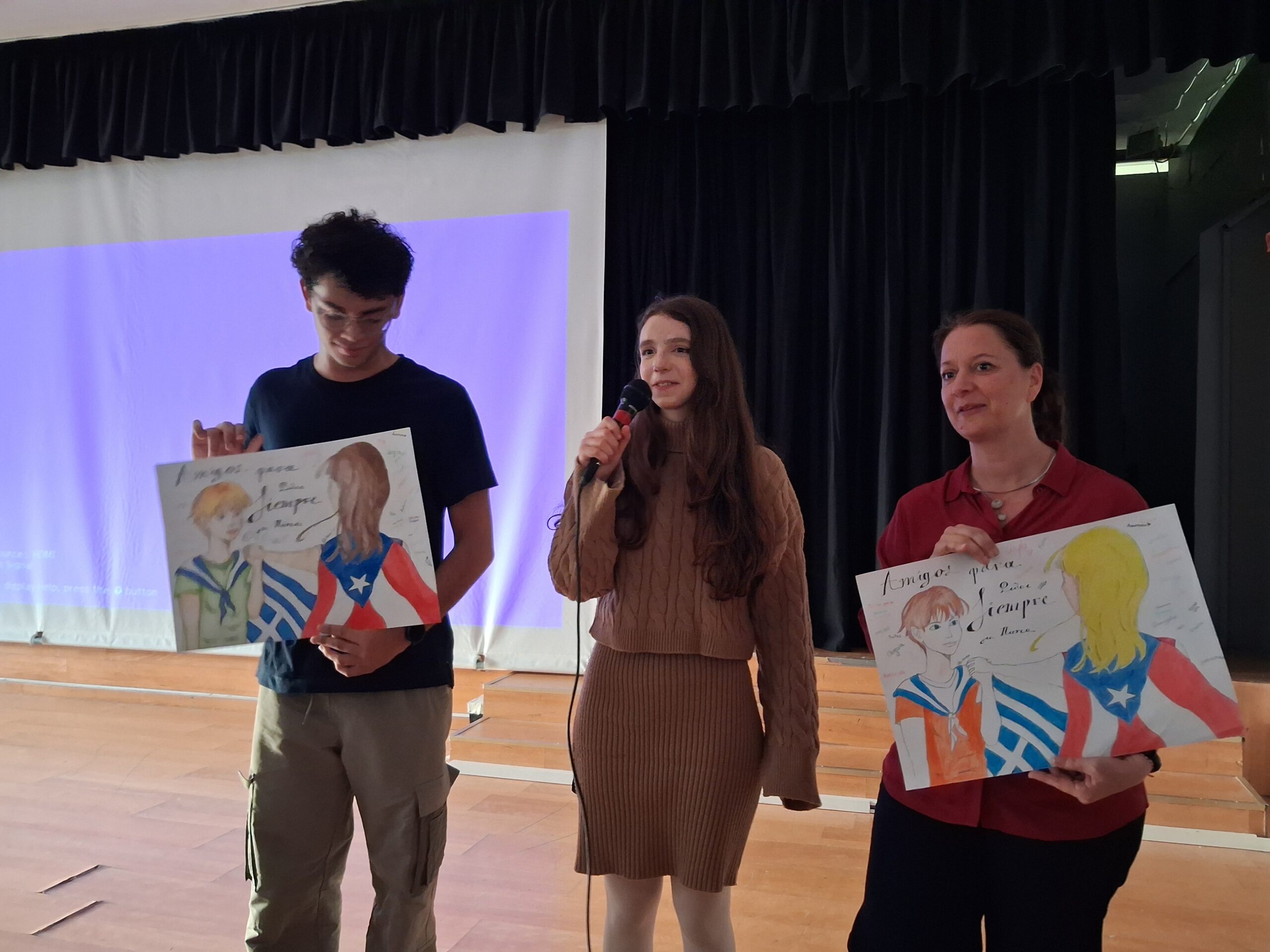 Τα παιδιά του Πουέρτο Ρίκο πέρασαν στην αίθουσα τεχνολογίας, όπου ζωγράφισαν με μολύβι ένα ακροκέραμο, ενώ παράλληλα μια ομάδα παιδιών μας ζωγράφιζε στην αίθουσα εκδηλώσεων δύο παρόμοια έργα με το σύνθημα: “Amigos para siempre/Φίλοι για πάντα”.