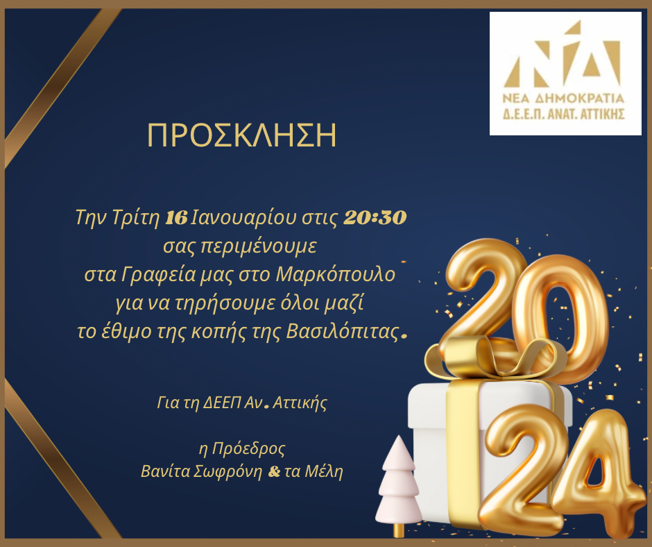 Η Διοικούσα Επιτροπή Εκλογικής Περιφέρειας ( Δ.Ε.Ε.Π – πρώην ΝΟΔΕ) Ν.Δ. Ανατολικής Αττικής θα κόψει τη βασιλόπιτά της, την Τρίτη 16 Ιανουαρίου και ώρα 20:30, στα Γραφεία της στο Μαρκόπουλο (Λεωφ. Σουνίου 33-35).