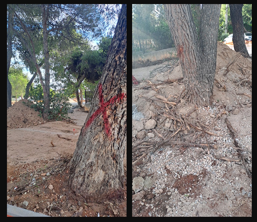 Όμως μέσα σ’ αυτόν τον χώρο υπάρχουν και πεύκα τα οποία είναι τραυματισμένα από τα οχήματα της αποψίλωσης με κομμένες ρίζες και άλλα εγκλωβισμένα μέσα στο τσιμέντο. Κάποια επίσης έχουν ένα κόκκινο Χ επάνω, ωσάν να είναι τα επόμενα θύματα…
