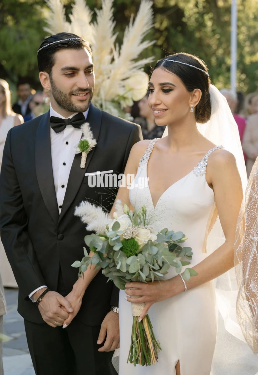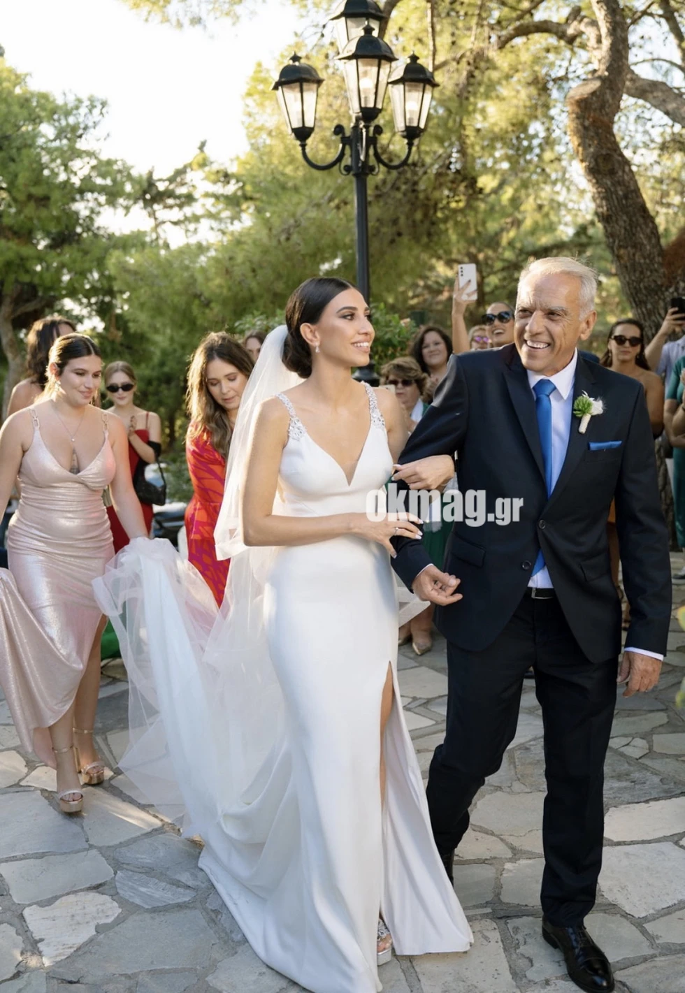 Η νύφη Μαρία Γανιάρη είναι απόφοιτος Φιλολογίας και μετά το μεταπτυχιακό στη Δημοσιογραφία και τα Νέα Μέσα θα κάνει πολύ σύντομα τα πρώτα βήματά της, στο χώρο της Δημοσιογραφίας. Για την ξεχωριστή ημέρα της ζωής της επέλεξε mermaid νυφικό φόρεμα με δαντέλα και βαθύ V-neckline σκίσιμο στο πόδι και ουρά. Τα μαλλιά της ήταν πιασμένα σε ένα low bun και στολισμένα με ένα μακρύ πέπλο.