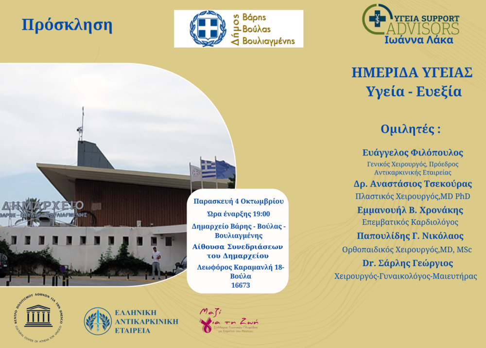 Ο Δήμος Βάρης Βούλας Βουλιαγμένης διοργανώνει την Παρασκευή 4 Οκτωβρίου και ώρα 19.00, στην αίθουσα του Δημοτικού Συμβουλίου του Δημαρχείου Βάρης Βούλας Βουλιαγμένης, ημερίδα υγείας με θέμα «Υγεία – Ευεξία». Με τη συνεργασία του Κέντρου Πολιτισμού Αθηνών για την UNESCO, της Ελληνικής Αντικαρκινικής Εταιρείας και του Συλλόγου Γυναικών Γλυφάδας με Καρκίνο του Μαστού ‘’Μαζί για τη Ζωή’’.