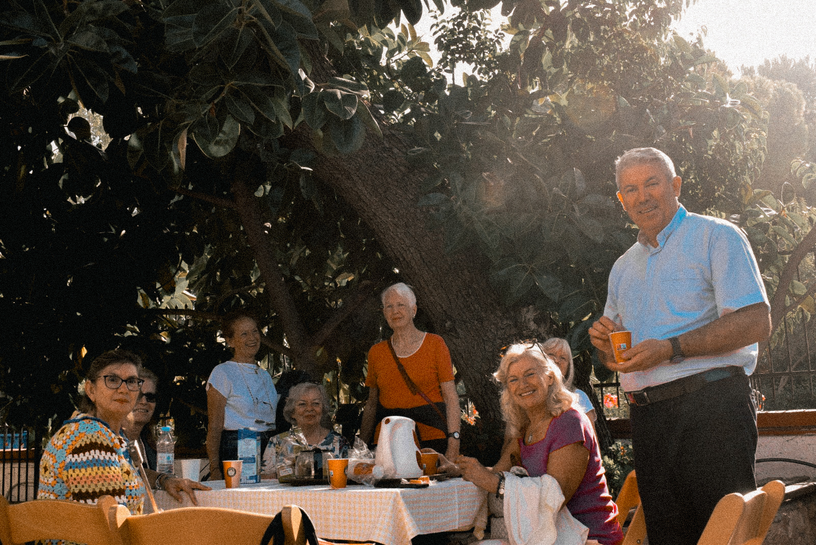 Ο Κοσμάς, ο μόνος άνδρας που παρακολούθησε τη λειτουργία νωρίτερα, είναι Έλληνας. Δεν θα κάτσει για καφέ, ήρθε στο τραπέζι μόνο για να χαιρετήσει και να πει δυο κουβέντες για τον πατέρα Κρίστιαν. «Έχει μια παιδική αγνότητα», θα πει συγκεκριμένα. «Η συμπεριφορά του και ο τρόπος που σε προσεγγίζει μου θυμίζει το πώς ήμασταν όλοι πριν από 20-30 χρόνια, πιο ανθρώπινοι». Πριν ολοκληρώσει τη φράση του έχει ήδη φορέσει τα γυαλιά ηλίου του κι έχει περάσει το τσαντάκι του στον ώμο, αλλά δεν θα προλάβει να απομακρυνθεί προς την καγκελένια αυλόπορτα – ο πατέρας Κρίστιαν κάνει την εμφάνισή του στο προαύλιο. Ο Κοσμάς αλλάζει αμέσως κατεύθυνση, τον πλησιάζει, λένε κάτι στα πεταχτά και αποχαιρετιούνται με hi-5.