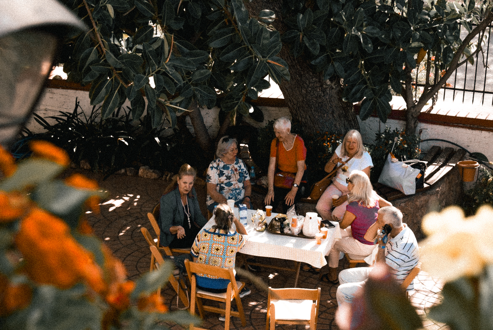 Στην αυλή της εκκλησίας το κλίμα είναι εντελώς διαφορετικό. Πάνω στο στρωμένο τραπέζι υπάρχουν κουλουράκια σε τρεις διαφορετικές γεύσεις, δροσερό νερό, χυμός πορτοκάλι και βέβαια, ο προαναγγελθείς αχνιστός καφές φίλτρου. Γύρω από το τραπέζι συγκεντρώνονται γυναίκες που χαμογελούν, αγκαλιάζονται, μιλούν γρήγορα και φωναχτά. Είναι σίγουρο ότι χαίρονται που βλέπουν η μία την άλλη κι έχουν μια ευκαιρία να πουν τα νέα τους.