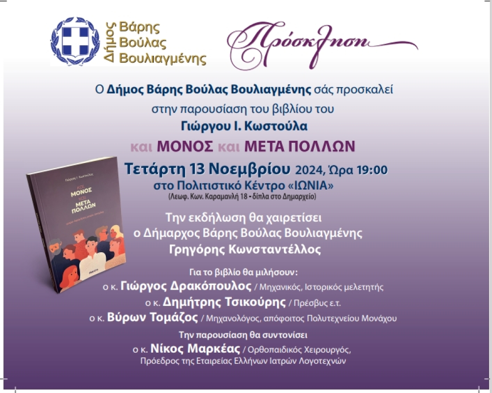 Ο Δήμος Βάρης Βούλας Βουλιαγμένης σας προσκαλεί στην παρουσίαση του βιβλίου του Γιώργου Ι. Κωστούλα «και ΜΟΝΟΣ και ΜΕΤΑ ΠΟΛΛΩΝ», την Τετάρτη 13 Νοεμβρίου 2024 και ώρα 19.00, στο Πολιτιστικό Κέντρο «ΙΩΝΙΑ».