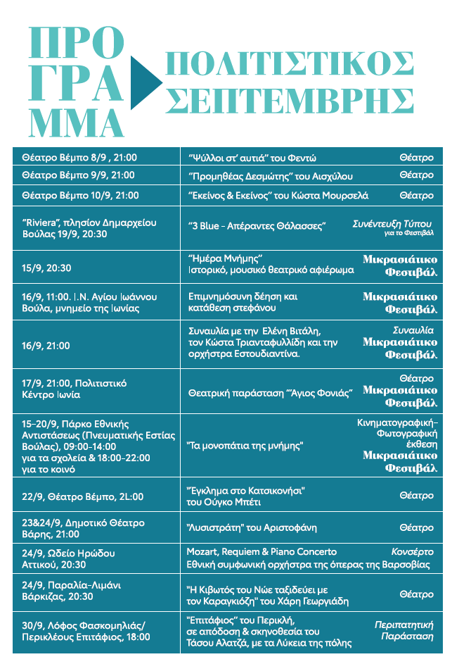 Ένας πλούσιος πολιτιστικός Σεπτέμβριος έρχεται στον Δήμο Βάρης Βούλας Βουλιαγμένης, από 8 έως 30 Σεπτεμβρίου, με σημαντικές θεατρικές παραστάσεις για μικρούς και μεγάλους, μοναδικές συναυλίες του σύγχρονου αλλά και του κλασσικού ρεπερτορίου.