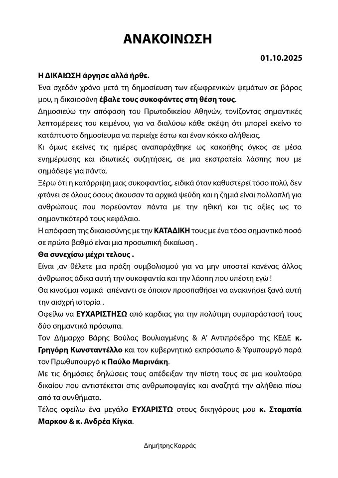 Ένα σχεδόν χρόνο μετά τη δημοσίευση των εξωφρενικών ψεμάτων σε βάρος μου, η δικαιοσύνη έβαλε τους συκοφάντες στη θέση τους. Δημοσιεύω την απόφαση του Πρωτοδικείου Αθηνών, τονίζοντας σημαντικές λεπτομέρειες του κειμένου, για να διαλύσω κάθε σκέψη ότι μπορεί εκείνο το κατάπτυστο δημοσίευμα να περιείχε έστω και έναν κόκκο αλήθειας. Κι όμως εκείνες τις ημέρες αναπαράχθηκε ως κακοήθης όγκος σε μέσα ενημέρωσης και ιδιωτικές συζητήσεις, σε μια εκστρατεία λάσπης που με σημάδεψε για πάντα. Ξέρω ότι η κατάρριψη μιας συκοφαντίας, ειδικά όταν καθυστερεί τόσο πολύ, δεν φτάνει σε όλους όσους άκουσαν τα αρχικά ψεύδη και η ζημιά είναι πολλαπλή για ανθρώπους που πορεύονταν πάντα με την ηθική και τις αξίες ως το σημαντικότερό τους κεφάλαιο. Η απόφαση της δικαιοσύνης με την ΚΑΤΑΔΙΚΗ τους με ένα τόσο σημαντικό ποσό σε πρώτο βαθμό είναι μια προσωπική δικαίωση. Θα συνεχίσω μέχρι τέλους. Είναι ,αν θέλετε μια πράξη συμβολισμού για να μην υποστεί κανένας άλλος άνθρωπος άδικα αυτή την συκοφαντία και την λάσπη που υπέστη εγώ ! Θα κινούμαι νομικά απέναντι σε όποιον προσπαθήσει να ανακινήσει ξανά αυτή την αισχρή ιστορία. Οφείλω να ΕΥΧΑΡΙΣΤΗΣΩ από καρδιάς για την πολύτιμη συμπαράστασή τους δύο σημαντικά πρόσωπα. Τον Δήμαρχο Βάρης Βούλας Βουλιαγμένης & Α’ Αντιπρόεδρο της ΚΕΔΕ κ. Γρηγόρη Κωνσταντέλλο και τον κυβερνητικό εκπρόσωπο & Υφυπουργό παρά τον Πρωθυπουργό κ Παύλο Μαρινάκη. Με τις δημόσιες δηλώσεις τους απέδειξαν την πίστη τους σε μια κουλτούρα δικαίου που αντιστέκεται στις ανθρωποφαγίες και αναζητά την αλήθεια πίσω από τα συνθήματα. Τέλος οφείλω ένα μεγάλο ΕΥΧΑΡΙΣΤΩ στους δικηγόρους μου κ. Σταματία Μάρκου & κ. Ανδρέα Κίγκα.
