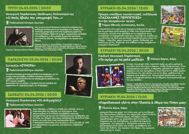 Με ένα πλούσιο πρόγραμμα εκδηλώσεων για μικρούς και μεγάλους, ο Δήμος Βάρης Βούλας Βουλιαγμένης υποδέχεται το Πάσχα του 2026, συνδυάζοντας πολιτισμό, παράδοση και δημιουργική ψυχαγωγία.