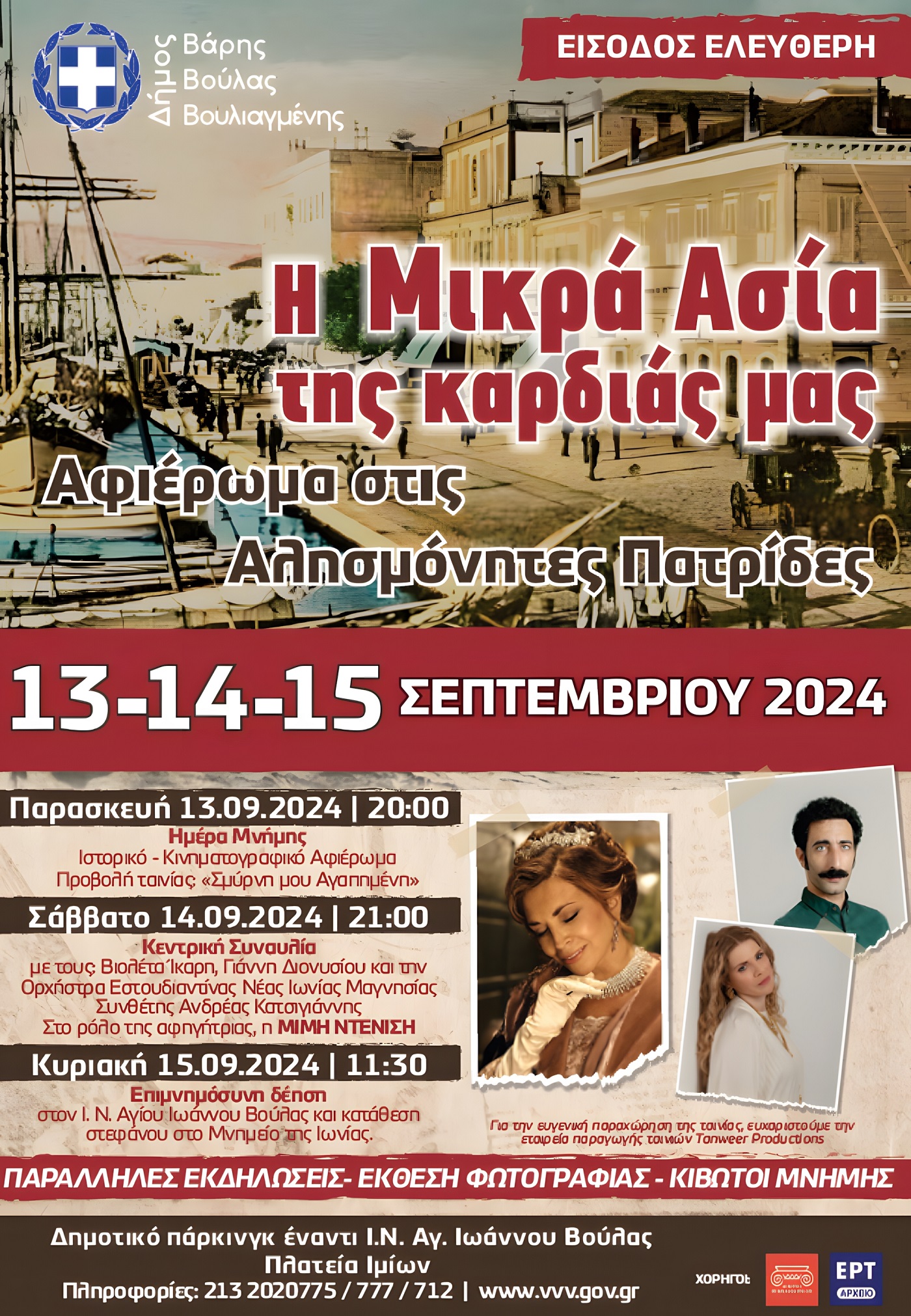 Ο Δήμος Βάρης Βούλας Βουλιαγμένης, μετά την επιτυχία των οκτώ προηγούμενων Φεστιβάλ, τα οποία παρακολούθησαν πάνω από 30.000 άτομα, διοργανώνει για ένατη συνεχή χρονιά, εκδηλώσεις για το Μικρασιατικό Ελληνισμό, με τίτλο, “Η Μικρά Ασία της καρδιάς μας – Ημέρες Μνήμης” στις 13, 14 & 15 Σεπτεμβρίου 2024 στην πλατεία “ΙΜIΩΝ”, κεντρική πλατεία Βούλας.