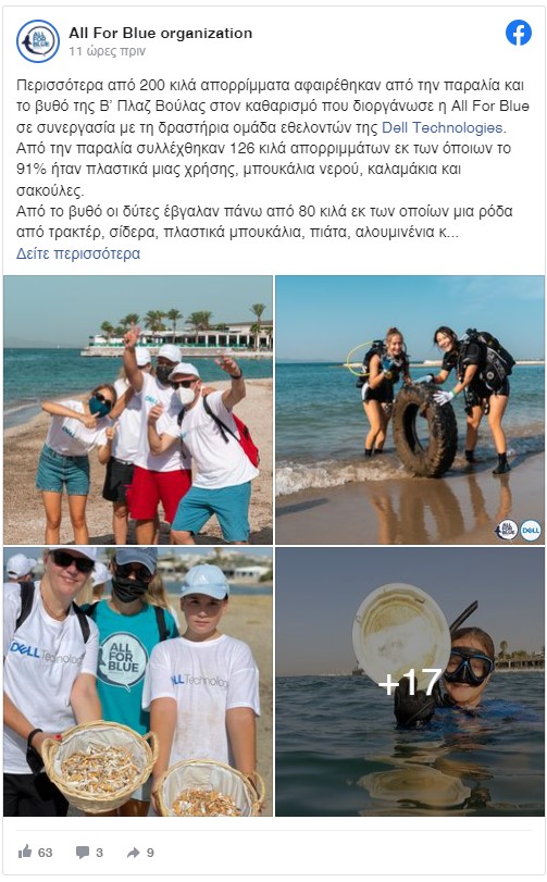 Περισσότερα από 200 κιλά απορρίμματα αφαιρέθηκαν από την παραλία και το βυθό της Β’ Πλαζ Βούλας στον καθαρισμό που διοργάνωσε η All For Blue σε συνεργασία με τη δραστήρια ομάδα εθελοντών της Dell Technologies.