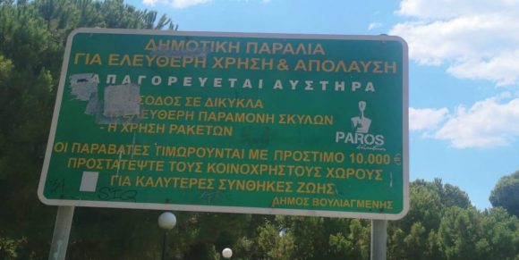 Η ειρωνία; Στο χώρο υπάρχει ταμπέλα που δεσπόζει και γράφει: «Δημοτική Παραλία για Ελεύθερη Χρήση και Απόλαυση».