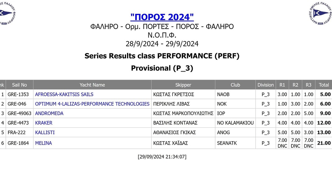 Διακρίθηκαν το σκάφος του Ναυτικό Αθλητικού Ομίλου Βούλας ΑΦΡΟΕΣΣΑ Kakitsis Sails, ο καπετάνιος Κώστας Γκρέτσος και το πλήρωμα του Έρικ Φίσερ,Φωτεινή Κακριδώνη και Λεωνίδας Κούφαλης για τις επιτυχίες τους στον ΙΣΤΙΟΠΛΟΪΚΟ ΑΓΩΝΑ ΑΝΟΙΚΤΗΣ ΘΑΛΑΣΣΗΣ «ΠΟΡΟΣ 2024» που διοργανώθηκε με ιδιαίτερη επιτυχία από το Ναυτικό Όμιλο Παλαιού Φαλήρου Ν.Ο.Π.Φ το Σάββατο 28/09/2024 και την Κυριακή 29/09/2024.