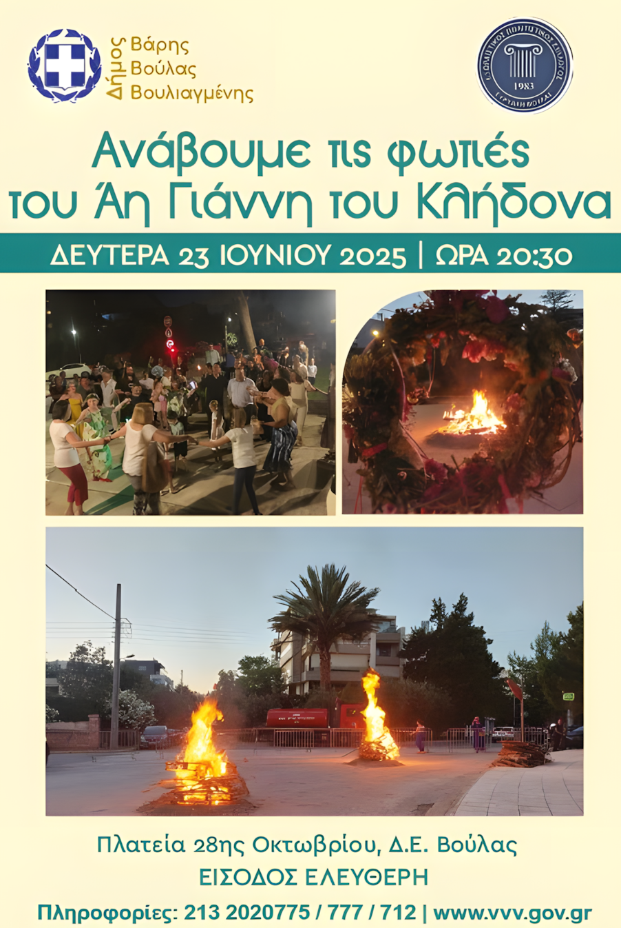 Τη Δευτέρα 23 Ιουνίου 2025 στις 20:30, η Πλατεία 28ης Οκτωβρίου στη Βούλα θα μετατραπεί για ακόμη μία χρονιά σε ζωντανή σκηνή λαϊκής μνήμης και παράδοσης. Ο Εξωραϊστικός Σύλλογος «Ευρυάλη» Βούλας, με τη στήριξη του Δήμου Βάρης Βούλας Βουλιαγμένης, προσκαλεί κατοίκους και επισκέπτες να συμμετάσχουν στην αναβίωση του εθίμου του Άη Γιάννη του Κλήδονα, με φωτιές, τραγούδια και χορούς.