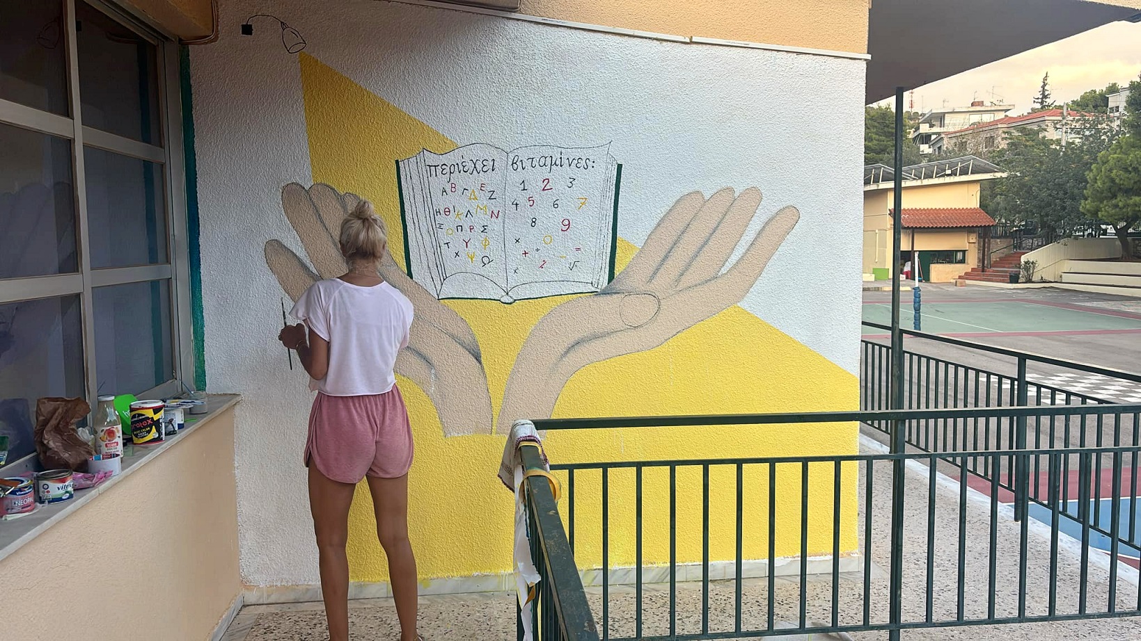 Στο Γυμνάσιο Βουλιαγμένης, κατά τη διάρκεια του καλοκαιριού, η Ιωάννα Βαμβακάρη αφιέρωσε πολλές ημέρες για να δημιουργήσει ένα εντυπωσιακό, πολύχρωμο γκράφιτι στον εξωτερικό τοίχο του κτιρίου.