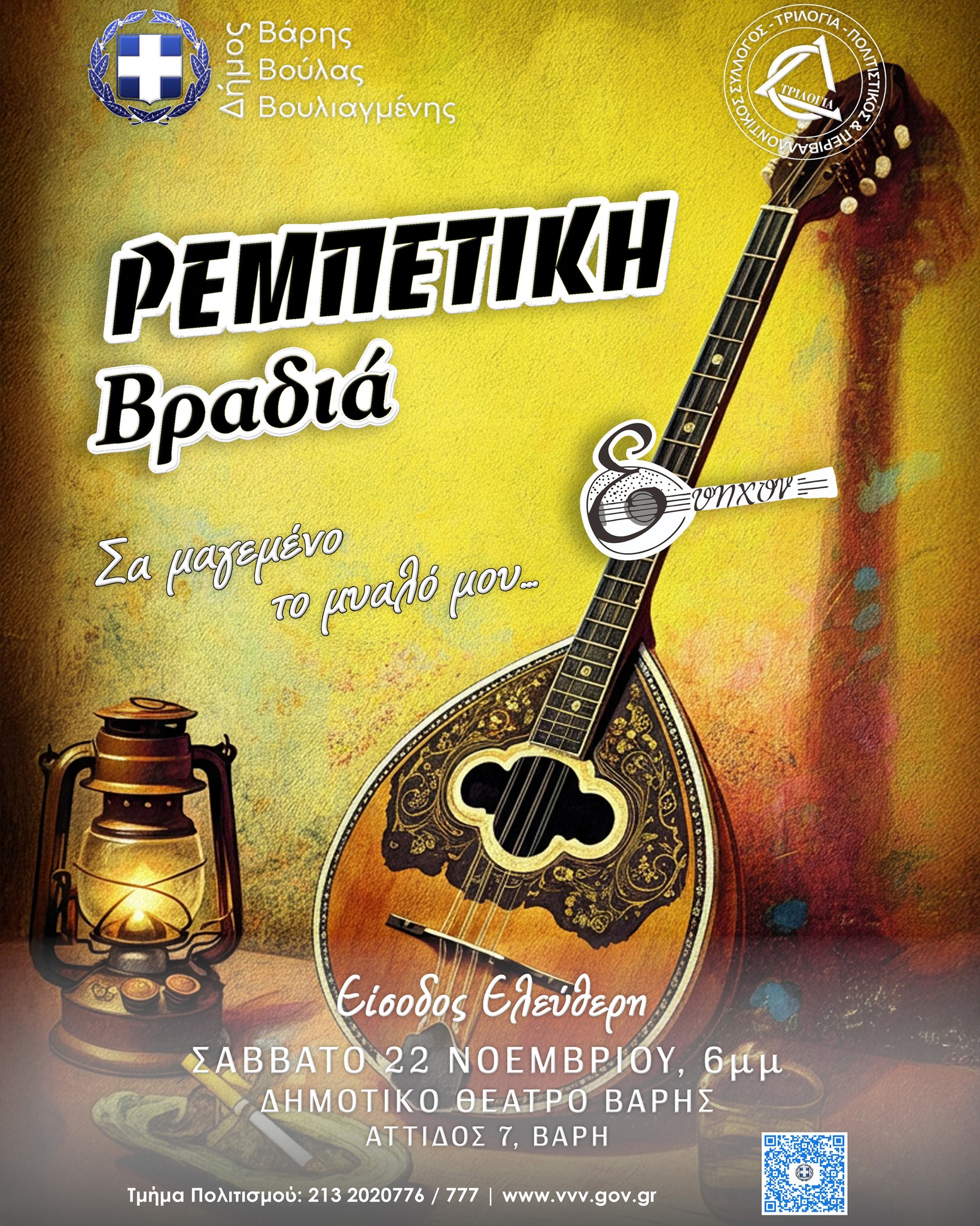 Ο Πολιτιστικός Σύλλογος «Τριλογία» και ο Δήμος Βάρης-Βούλας-Βουλιαγμένης διοργανώνουν μια ρεμπέτικη βραδιά με τίτλο «Σα μαγεμένο το μυαλό μου». Η εκδήλωση θα πραγματοποιηθεί το Σάββατο 22 Νοεμβρίου, στις 6:00 μ.μ., στο Δημοτικό Θέατρο Βάρης (Αττιδός 7).