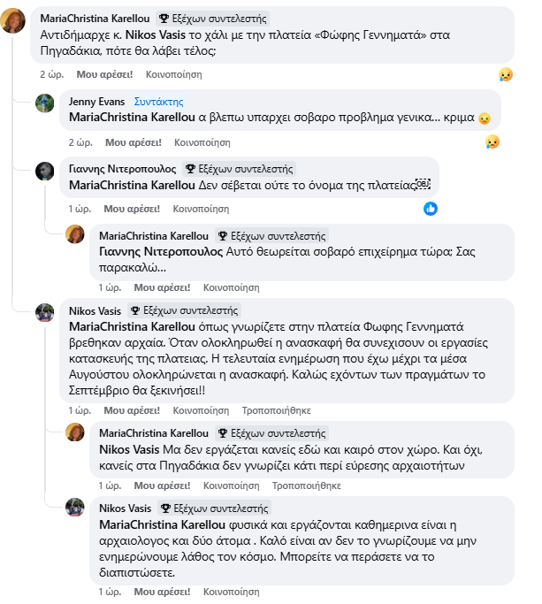 «Όπως γνωρίζετε, στην πλατεία Φώφης Γεννηματά βρέθηκαν αρχαία. Όταν ολοκληρωθεί η ανασκαφή, θα συνεχιστούν οι εργασίες κατασκευής της πλατείας. Η τελευταία ενημέρωση που έχω είναι πως μέχρι τα μέσα Αυγούστου ολοκληρώνεται η ανασκαφή. Καλώς εχόντων των πραγμάτων, τον Σεπτέμβριο θα ξεκινήσει!»
