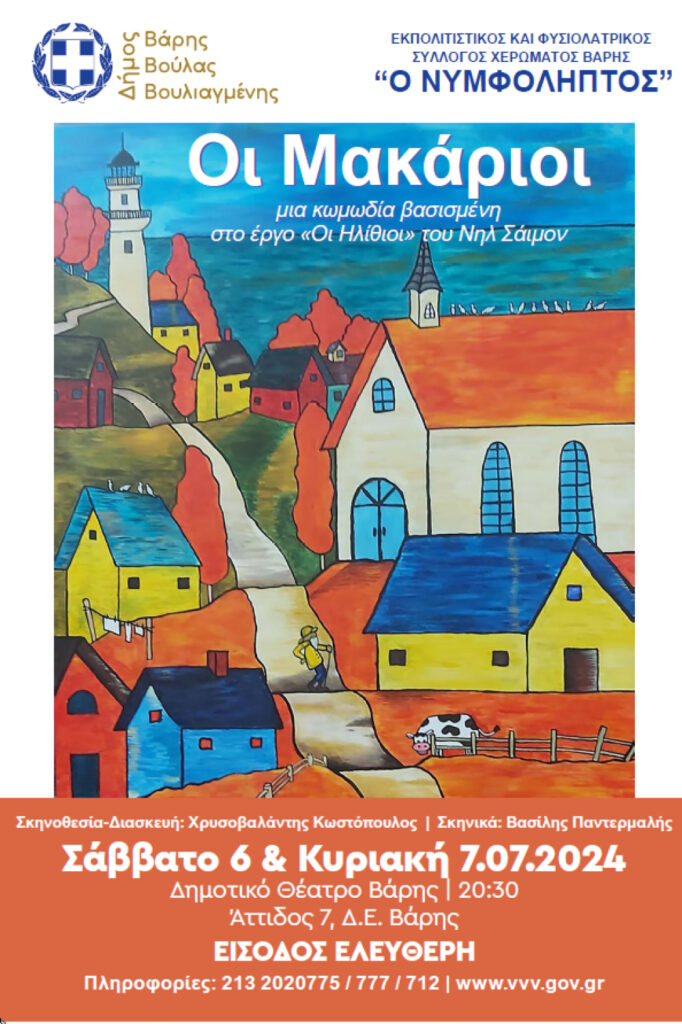 Η ερασιτεχνική θεατρική ομάδα «Οι Θεατρίνοι» του Εκπολιτιστικού και Φυσιολατρικού συλλόγου Χερώματος Βάρης «Νυμφόληπτος», παρουσιάζουν στις 6 και 7 Ιουλίου του 2024 στο Δημοτικό Θέατρο Βάρης την παράσταση ‘’Οι Μακάριοι’’. Μια ξεκαρδιστική σουρεαλιστική κωμωδία βασισμένη στο έργο ‘’Οι Ηλίθιοι’’ του Νηλ Σάιμον. Ένας δάσκαλος φτάνει σε ένα απόμερο χωριό της Ουκρανίας στα τέλη του 1800. Στο χωριό αυτό που λέγεται Κουλιέντσικοφ, υπάρχει μία κατάρα εδώ και 200 χρόνια που εμποδίζει όλους τους κατοίκους να σκέφτονται λογικά. Αυτό έχει σαν αποτέλεσμα όλοι οι κάτοικοί του να συμπεριφέρονται παράλογα και να είναι ηλίθιοι. Όταν ο καινούργιος δάσκαλος Λέων Τολτσίνσκι ερωτευτεί την κόρη του γιατρού του χωριού, Σοφία Ζουμπρίτσκι, θέτει στόχο να σπάσει την κατάρα που έχει πέσει στο χωριό. Θέλει να επιτύχει έναν θρίαμβο της επιστήμης και της γνώσης ενάντια στη δυσειδαιμονία και τη μεταφυσική. Μόνο που ο χρόνος που έχει για να το φέρει εις πέρας αυτό είναι μία ημέρα. Αν δεν τα καταφέρει θα γίνει κι αυτός ηλίθιος.