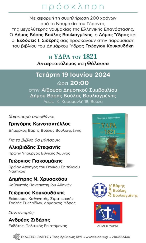 Ο Δήμος Βάρης Βούλας Βουλιαγμένης, ο Δήμος Ύδρας και οι Εκδόσεις Ι. Σιδέρη σας προσκαλούν την Τετάρτη 19 Ιουνίου 2024, ώρα 20.00, στην αίθουσα του Δημοτικού Συμβουλίου του Δήμου Βάρης Βούλας Βουλιαγμένης, στη παρουσίαση βιβλίου του Δημάρχου Ύδρας, Γεώργιου Κουκουδάκη με τίτλο «Η ΥΔΡΑ του 1821 – Ανταρτοπόλεμος στη Θάλασσα».
