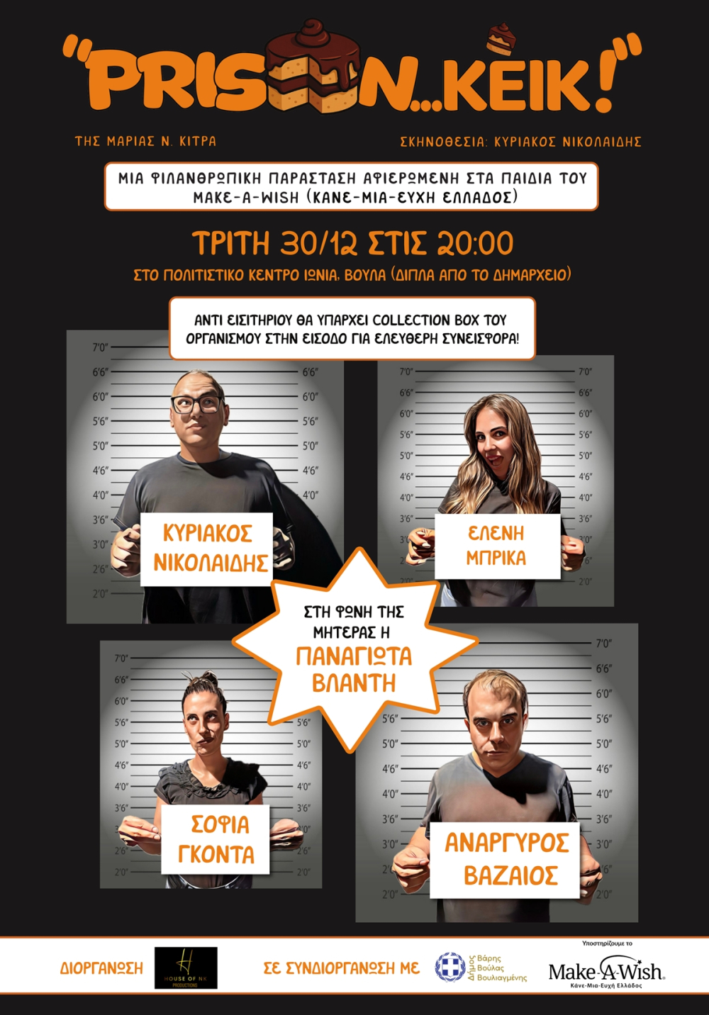 Την φιλανθρωπική θεατρική παράσταση «Prison… Κείκ!», παρουσιάζουν την Τρίτη 30 Δεκεμβρίου στις 20:00, στο Πολιτιστικό Κέντρο «Ιωνία» η «House of NK Productions» και ο Δήμος Βάρης Βούλας Βουλιαγμένης. Πρόκειται μια ξεκαρδιστική κωμωδία αφιερωμένη στα παιδιά του Make–A–Wish (Κάνε-Μια-Ευχή Ελλάδος). Αντί εισιτηρίου, στην είσοδο του χώρου θα υπάρχει collection box του Οργανισμού για ελεύθερη συνεισφορά.
