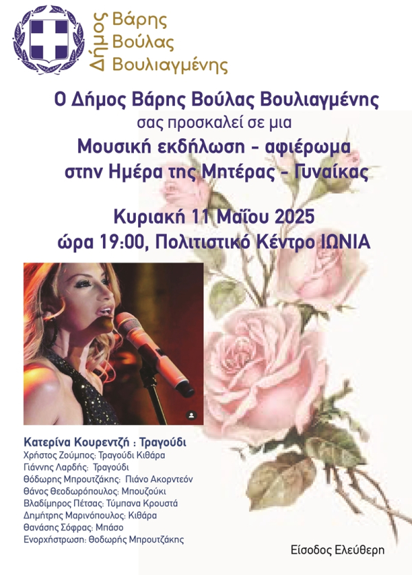 Ο Δήμος Βάρης Βούλας Βουλιαγμένης τιμά την Ημέρα της Μητέρας-Γυναίκας με μια ξεχωριστή μουσική εκδήλωση γεμάτη μελωδίες και συναίσθημα.