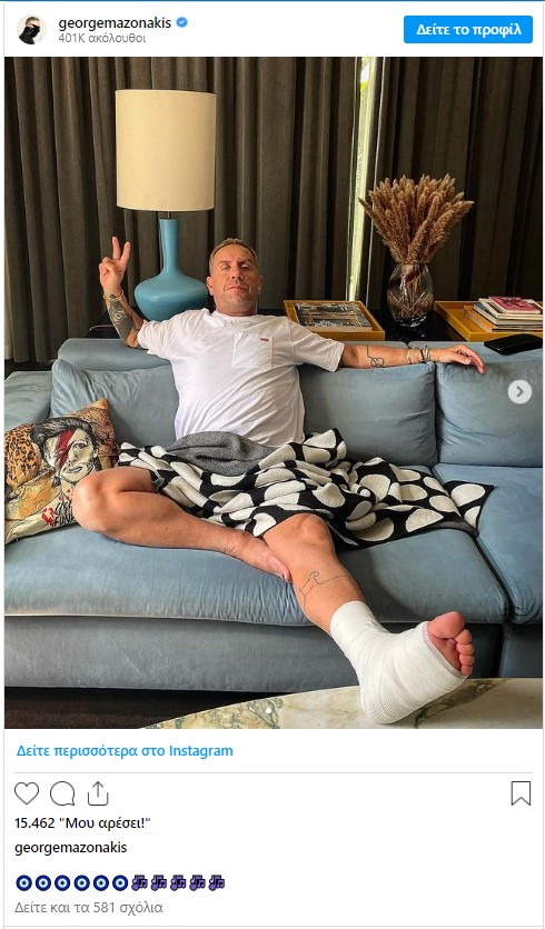 Ωστόσο, οι ατυχίες δεν σταματούν εκεί για τον Γιώργο Μαζωνάκη, αφού τις ημέρες του Πάσχα γλίστρησε κι έπαθε διάστρεμμα στο πόδι του, με αποτέλεσμα να μείνει καθηλωμένος στο σπίτι και να μην μπορέσει να πραγματοποιήσει ορισμένα ταξίδια που είχε προγραμματίσει.