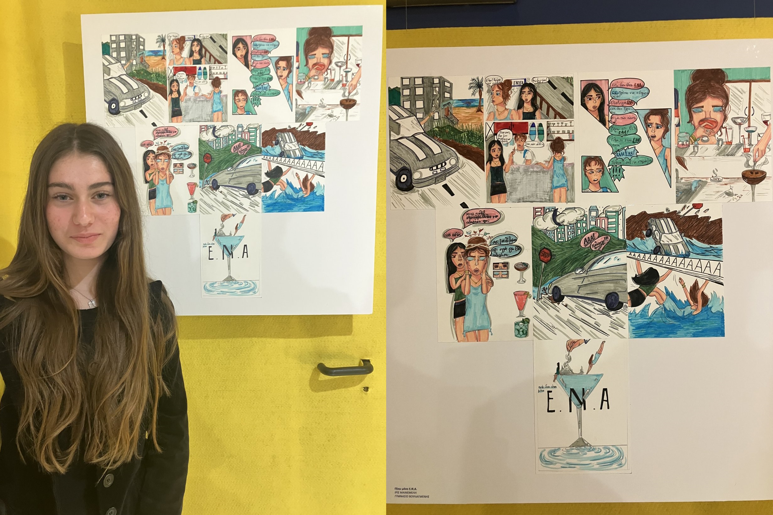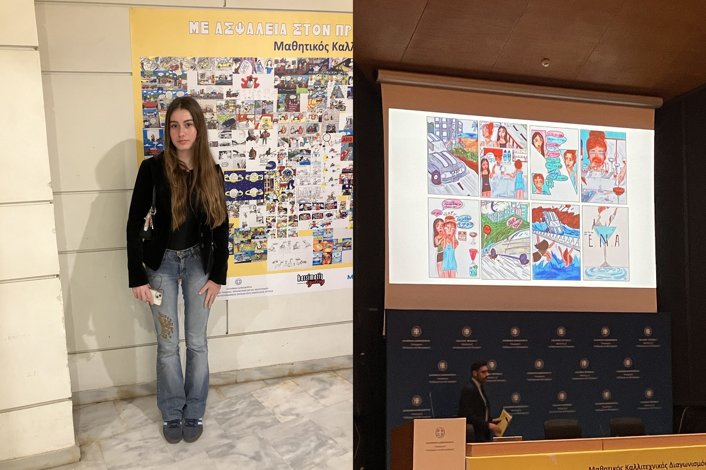 Η μαθήτρια Ίρις Μαινεμελή του Γυμνασίου Βουλιαγμένης βραβεύτηκε από το Υπουργείο Υποδομών και Μεταφορών, στο πλαίσιο του μαθητικού καλλιτεχνικού διαγωνισμού κόμικ «Οδηγώ με ασφάλεια», που διοργάνωσε η Διεύθυνση Δευτεροβάθμιας Εκπαίδευσης Ανατολικής Αττικής κατά το σχολικό έτος 2024-2025.